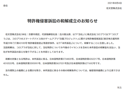 2021å¹´7æææ° 任天å vsã³ããã©ç¹è¨±ç´äº äºä»¶ ãã¥ã¼ã¹ã'å¼ç士ã解説 ã"ã¸ãã¹ã®ãã¬ã¸ã£ã¼ãã³ãã£ã³ã° from sho-startup.com Apr 22, 2021 · コロプラ裁判、まず任天堂はds(iphoneより3年も前に発売)でタッチパネルでのゲーム操作に関する特許を山ほど取っていて、スマホ含めタッチパネルを使うゲームはその特許を行使されると全滅するけど、任天堂としてはゲームを沢山作って欲しいので公開. May 01, 2021 · ・ 【悲報】コロプラが本気で作ったゲーム、終わる ・【朗報】ファイナルファンタジー史上最低最悪主人公がセシルさんに決定 ・【狂気】ユーチューバーが女に「コレ」をやる動画、もはや炎上どころではない・・・(動画あり)
